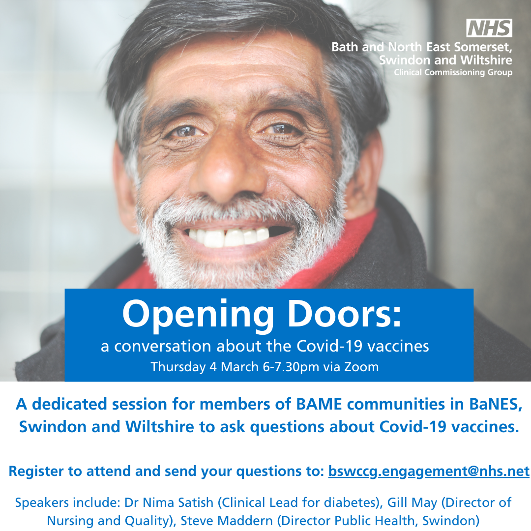 A dedicated session for members of BAME communities in BaNES, Swindon and Wiltshire is to be held via Zoom on Thursday 4th March.