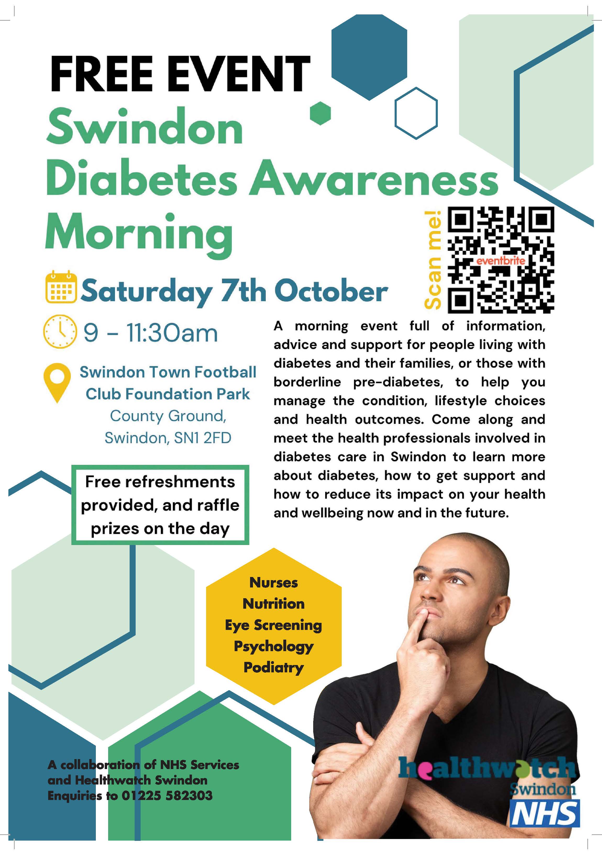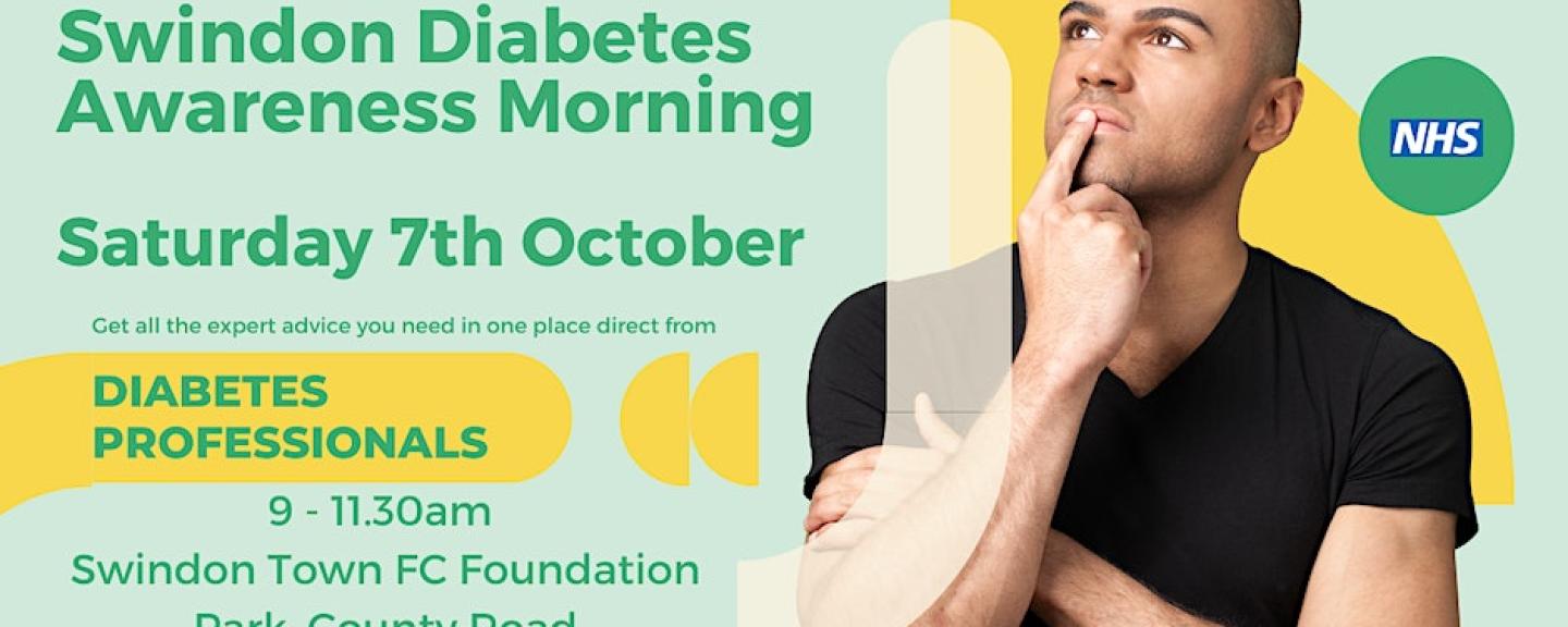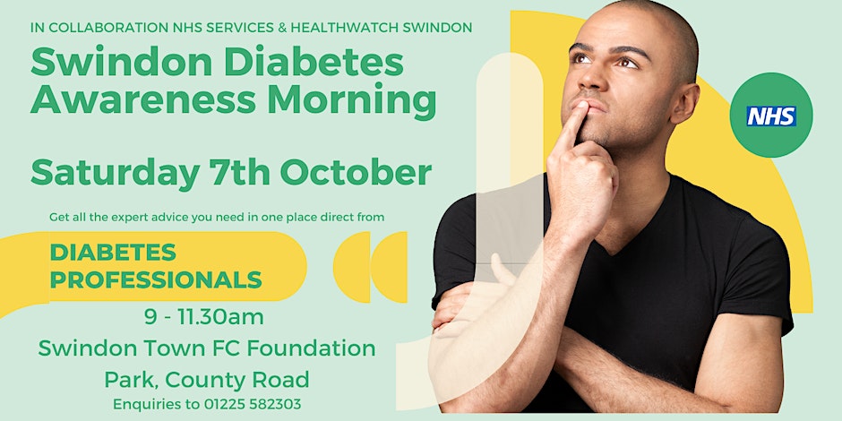 A morning event full of information, advice and support for people living with diabetes and their families, or those with borderline pre-diabetes, to help you manage the condition, lifestyle choices and health outcomes. Come along and meet the health professionals involved in diabetes care in Swindon (nurses, nutritionists, eye screening, foot care and psychologists) to learn more about diabetes, how to get support and how to reduce its impact on your health and wellbeing now and in the future.